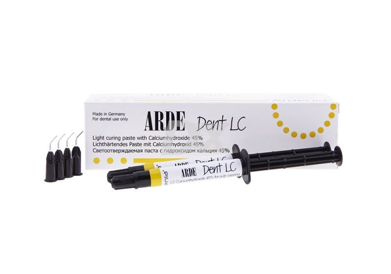 • Arde Dent LC – это прокладочный светоотверждаемый, рентгеноконтрастный однокомпонентный материал, содержащий гидроокись кальция.