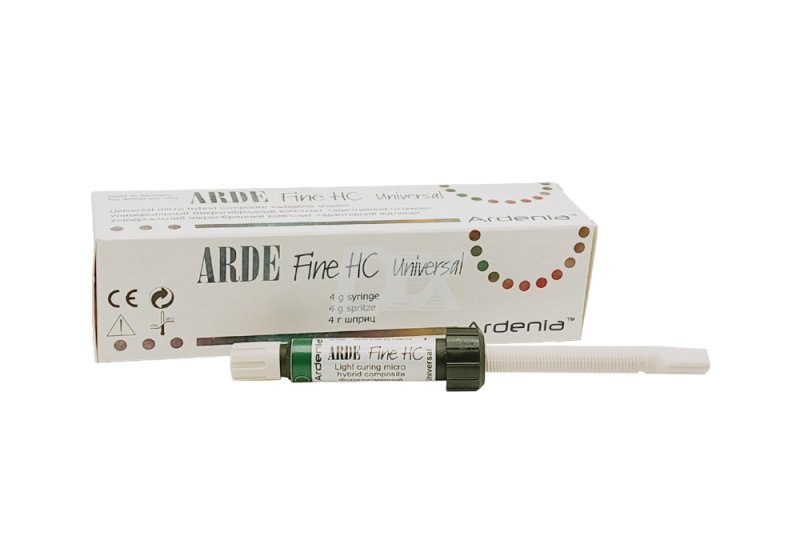 - Arde Fine Universal HC (Арде Файн Универсал Эйч Си) – высокоэстетический композитный материал "универсальный адаптивный цвет". Хорошо сочетается с 16 основными оттенками зубов и идеально повторяет базовый цвет реставрации. Новая формула наполнителя с высоким эффектом хамелеона позволяет создать четкую послойную копию разных оттенков, применяя материал только из одного шприца. Может воспроизводить оттенки как светлой группы (А1, А2, В1, В2, С1, С2, D2, D4), так и темной (A3, A3.5, A4, B3, B4, C3, C4, D3) без специального цветового подбора. .
