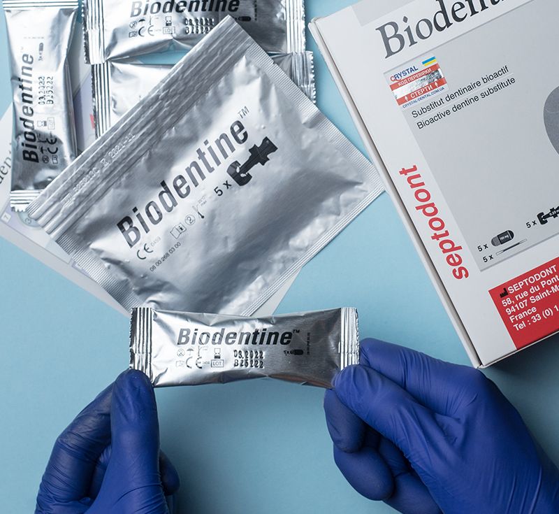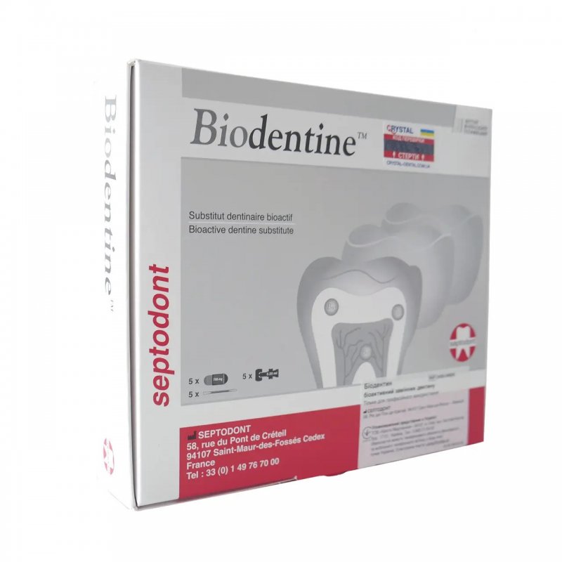 Biodentine™ (Septodont) — материал для постоянного замещения утраченного дентина в коронковой и корневой части зуба. По механическим свойствам он близок к естественному дентину и помогает сохранить витальность пульпы благодаря плотному «запечатыванию» поверхности дентина.