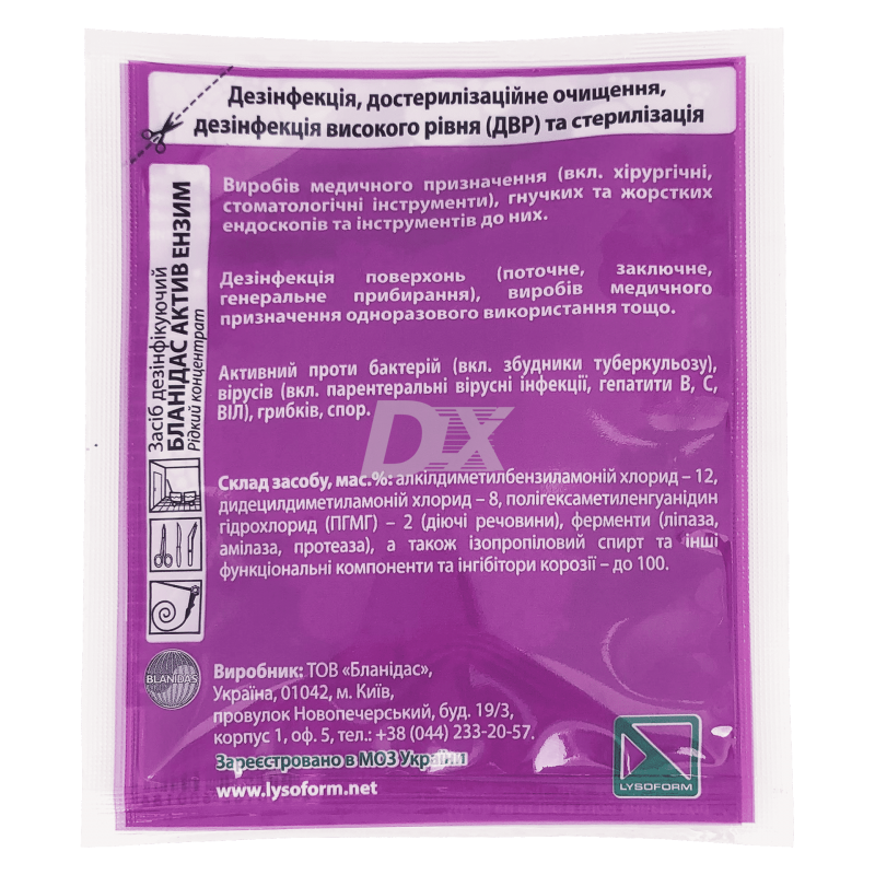 ОПИСАНИЕ Бланидас Актив энзим 20 мл - универсальное безальдегидное нехлорное средство для текущей, заключительной, профилактической дезинфекции и одновременного мытья всех типов поверхностей, для проведения генеральных уборок, для обеззараживания медицинских изделий