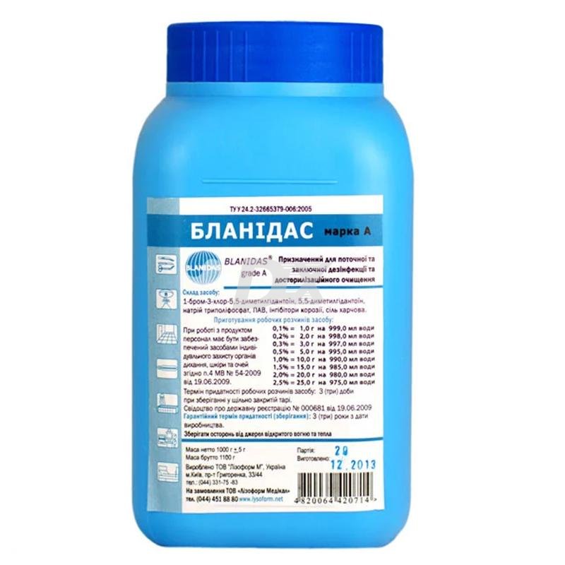 ОПИСАНИЕ Бланидас марка А 1 кг - универсальное хлорсодержащее порошкообразное средство для обеззараживания использованных медицинских изделий одноразового использования, перевязочного материала, пищевых отходов.