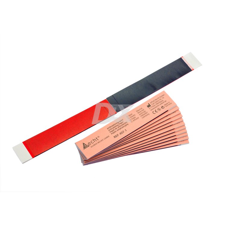 - Оклюзионная бумага Becht толщиной 80 мкм также является тонкой, но прочной бумагой, которая с обеих сторон покрыта жидкой краской. Эта бумага, как и сорокамикронная бумага, исключает получение ложных или смазанных контактных пунктов и обеспечивает точные, чёткие цветные отпечатки. Несколько большая толщина несущего материала позволяет производить эту бумагу в форме подковообразных полосок. Эта отштампованная бумага без затруднений накладывается на зубную поверхность и не требует применения специальных фиксирующих вилок или пинцетов.
