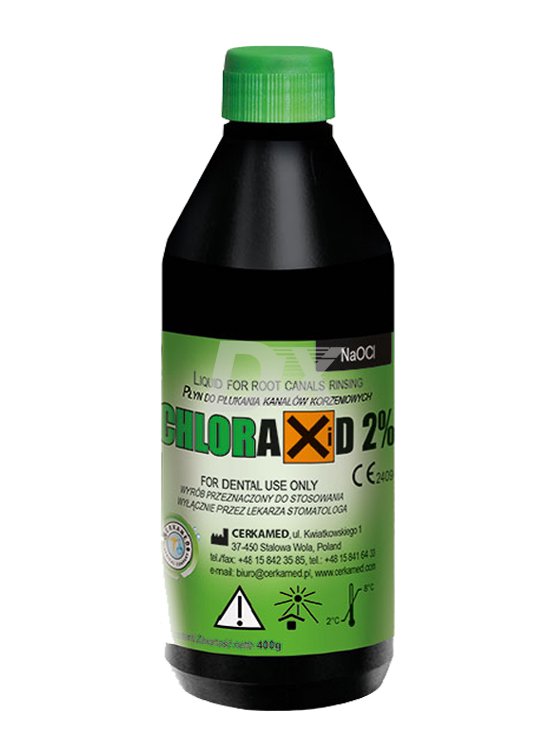 - Chloraxid (Хлораксид) применяется при эндодонтическом лечении, как самый популярный ирригант. Во время механического расширения канала устраняет остатки мертвой пульпы.