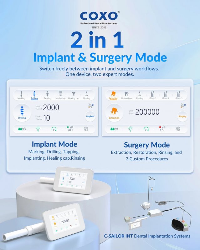 Управляемый сенсорным цветным дисплеем, беспроводной педалью, оснащен помпой для перекачивания охлаждающего стерильного раствора, работающий в режиме: Implant и Surgery.