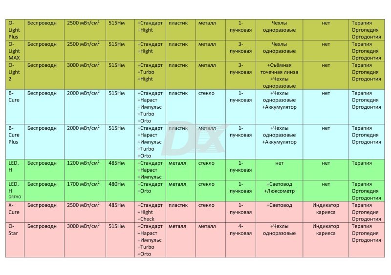 - интенсивность работы лампы составляет 2500 мВ/см2, что позволяет легко справиться с выполнением базовых процедур и расширяет возможности использования оборудования в ортодонтической практике для фиксации ортодонтических конструкций;