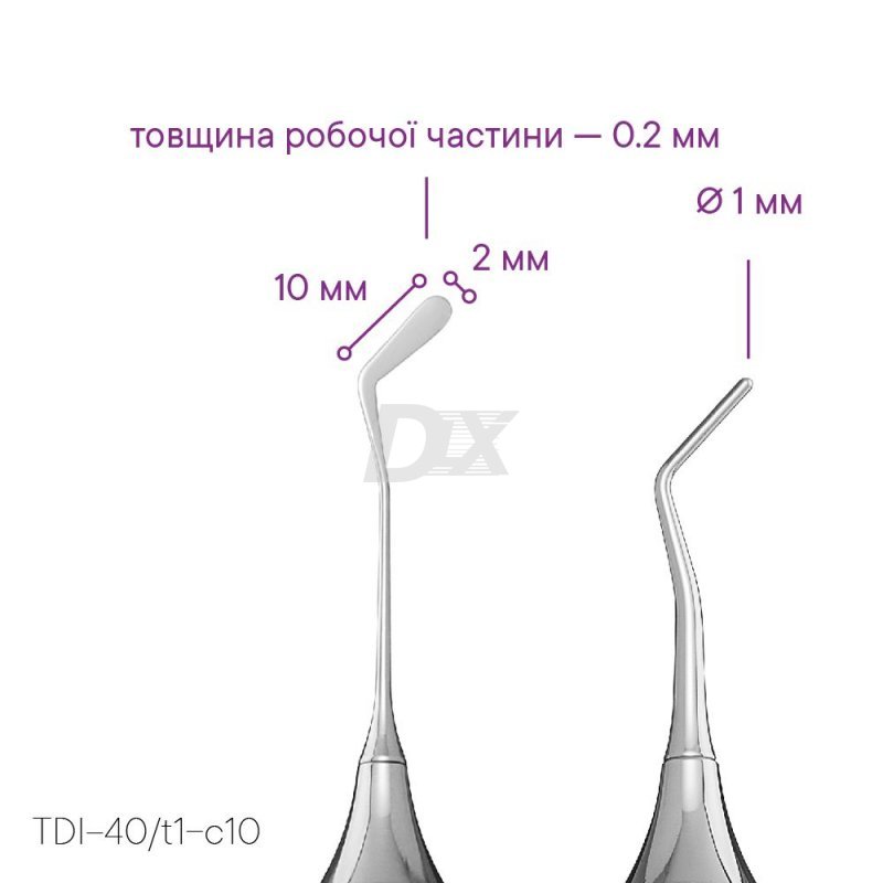 - Инструмент представляет собой комбинацию тончайшей гладилки Meddins TDI 40 t1 и штопфер в форме капли диаметром 1,0 мм.