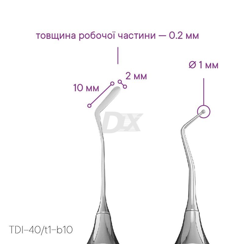 - Инструмент представляет собой комбинацию тончайшей гладилки Meddins TDI 40 t1 и штопфер в форме шара размером 1,0 мм.