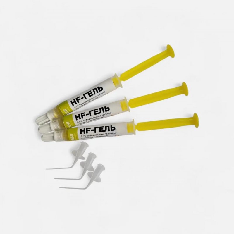 HF-Гель - это гель плавиковой кислоты в концентрации 9,5%. Используется для ремонта сколов коронок и мостов и из керамики и металлокерамики, цементирования ортопедических конструкций, подготовки штифтов из стекловолокна для установки в корневой канал.