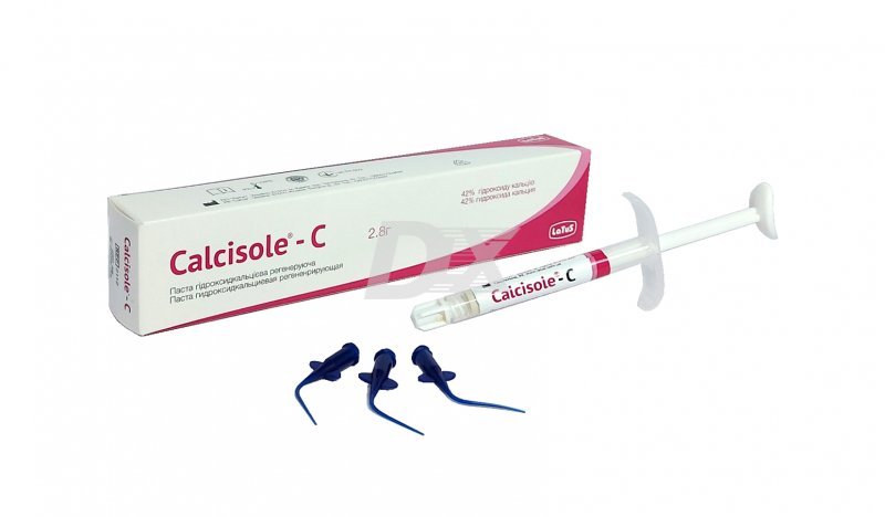 - Calcisole-С представляет собой готовую к применению пасту белого цвета, приготовленную на водной основе. Высокое содержание гидроокиси кальция (42%) создает повышенную щелочную реакцию (до рН 12), стимулируются регенерационные процессы в тканях зуба, стабилизируется жизнеспособность зуба и оказывается антимикробное действие. Calcisole-С активно помогает восстановлению пульпы и способствует формированию вторичного дентина. Паста рентгеноконтрастна.