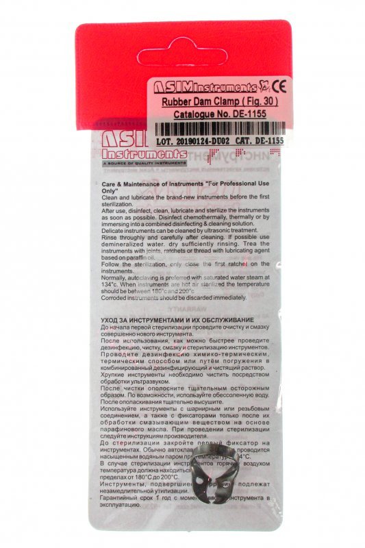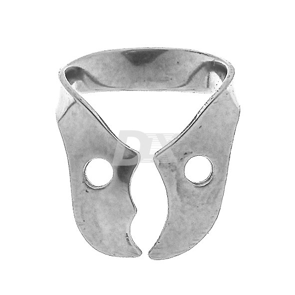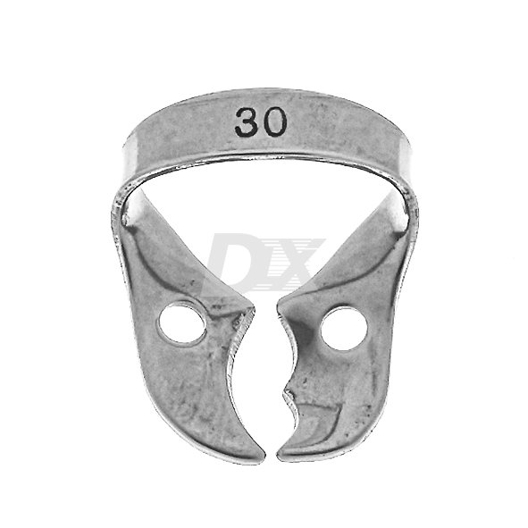 • Кламп №30 для моляров верхней челюсти справа. Щечки асимметричные, крылья отсутствуют. На одной из щечек есть шип, смещенный к медиальному, вестибулярному углу клампа. Он обеспечивает возможность дополнительной ретенции в области рецессии краевой десны в проекции фуркации корней моляров верхней челюсти с вестибулярной стороны (дефекты I-II класса по Гликману).