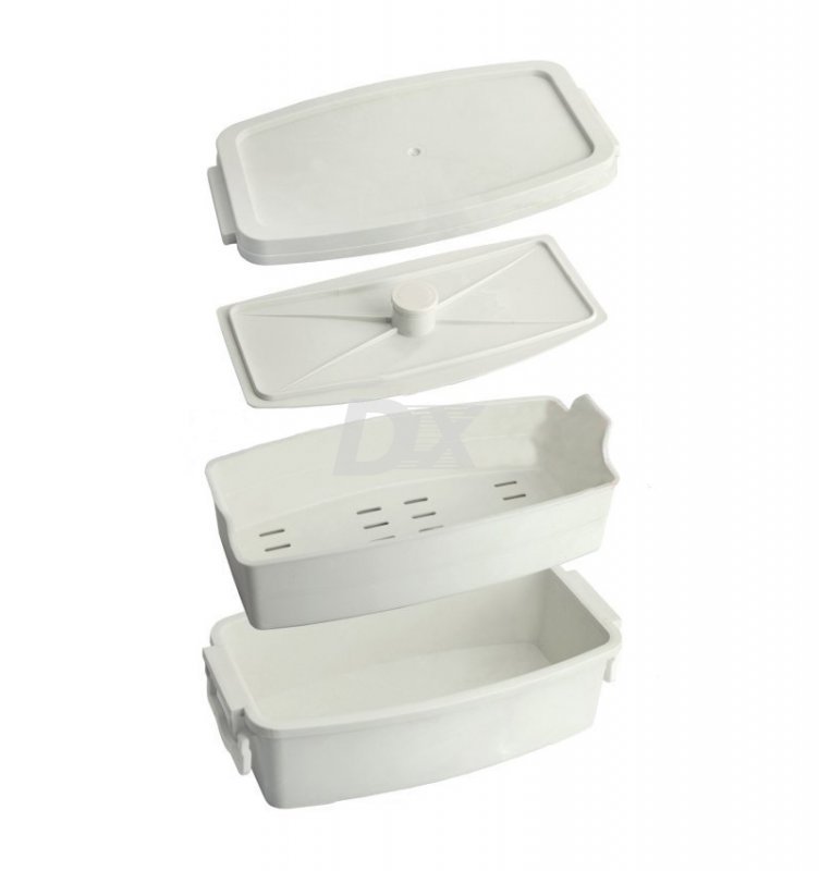 - Контейнер состоит из емкости-корпуса, во внутреннее пространство которого помещают емкость-корзину с решетчатым дном, в которую загружают медицинские изделия и инструменты. На инструменты укладывают пластину-груз для того, чтобы после заливания дезраствора, они не всплывали. Контейнер закрывают глухой крышкой и фиксируют на корпусе с помощью ручек-защелок.
