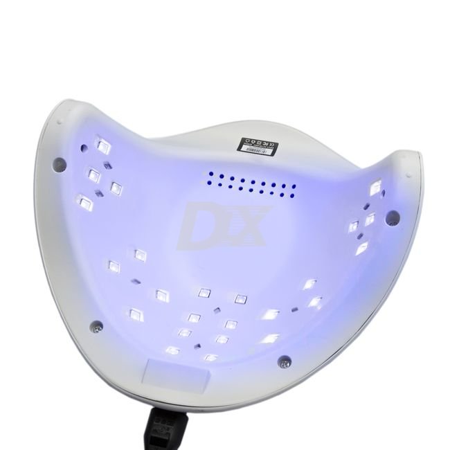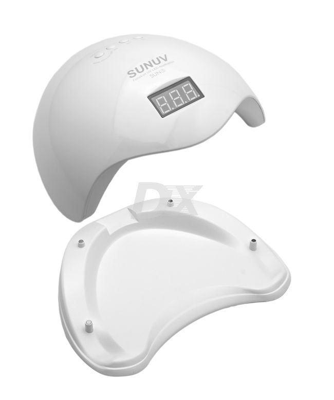 - Лампа SUN5 имеет пластиковый корпус белого цвета, на верхней части которого расположен электронный дисплей, на него выводится отсчёт таймера. Предусмотрено сенсорное включение лампы, для этого достаточно поместить руку внутрь лампы. В комплекте есть кабель для подключения лампы к сети 220В. Дно крепится на магнитных держателях и легко отсоединяется, что делает эту лампу удобной для педикюра.