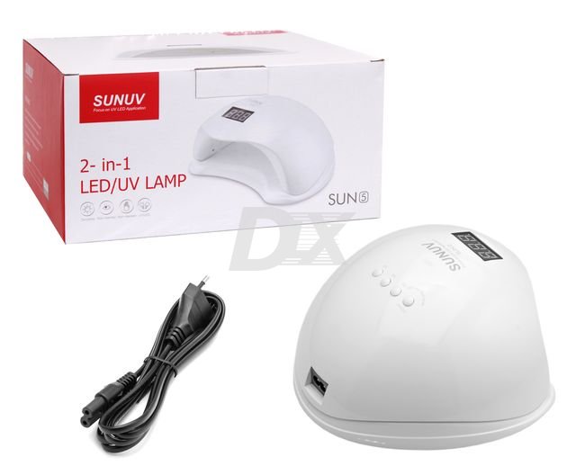 - UV LED лампа SUN5 48 Вт оснащена таймером на 10, 30 и 60 секунд. Благодаря компактным размерам и лаконичному дизайну она стильно смотрится, а за счет наличия всех необходимых функций упростит и ускорит процесс работы с гелевыми лаками, красками и гелями, восприимчивыми к спектру led-волн.