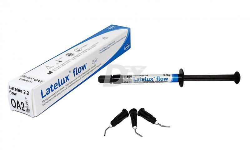- LATELUX flow относится к группе средне-наполненных микрогибридных композитов, твердеющих под воздействием света с длиной волны 400-500 нм. Высокая текучесть и оптимальные тиксотропные свойства материала позволяют вносить его непосредственно из шприца на реставрируемую поверхность или в полость. Пониженный модуль упругости в сочетании с адгезионными свойствами обеспечивает высококачественное краевое прилегание. Материал рентгеноконтрастный.
