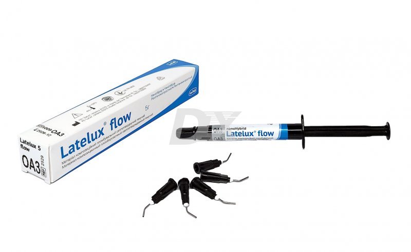 - LATELUX flow относится к группе средне-наполненных микрогибридных композитов, твердеющих под воздействием света с длиной волны 400-500 нм. Высокая текучесть и оптимальные тиксотропные свойства материала позволяют вносить его непосредственно из шприца на реставрируемую поверхность или в полость. Пониженный модуль упругости в сочетании с адгезионными свойствами обеспечивает высококачественное краевое прилегание. Материал рентгеноконтрастный.