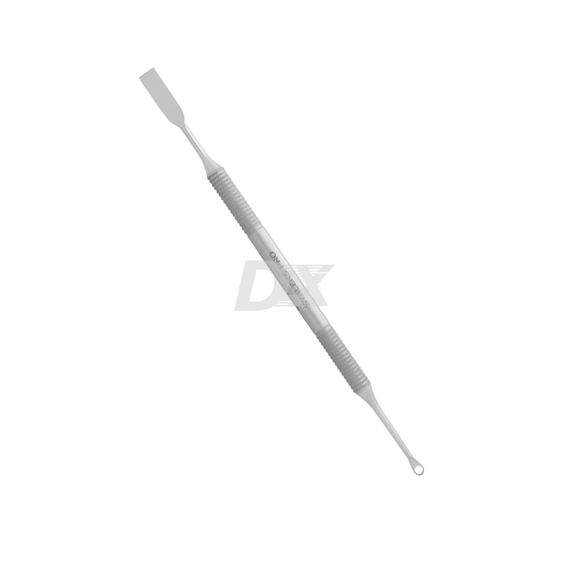 - Рабочая сторона в меру острая, благодаря чему отлично справляется с плотно нарастающей кожицей, но при этом не травмирует ногтевую пластину. Другая часть пушера представляет собой маленькое колечко, предназначенное для удаления налипшего птеригия. Лопатка PE-51/1 изготовлена из стали марки 40Х13, характеризующейся высокой коррозийной устойчивостью.