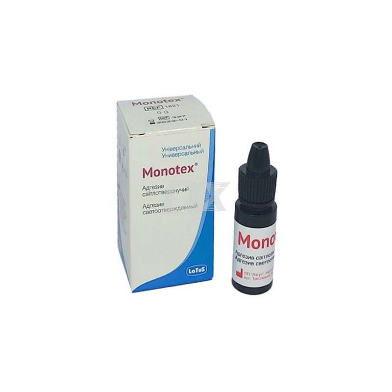 - Monotex изготовлен на основе специально синтезированного связующего на основе Бис-ГМА, ГЕМА и глутарового альдегида. Адгезив также содержит эффективный детергент-антисептик-бензалкония хлорид, 17% наполнителя с размером частиц 0,4 мкм и минимальное количество (до 15%) высоколетучего многокомпонентного растворителя. Благодаря механическому воздействию наполнителя при нанесении адгезива происходит заполнение устьев дентинных трубочек с образованием дополнительной механической связи пломбировочного материала со стенками полости.