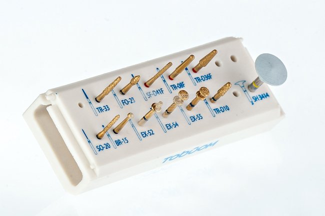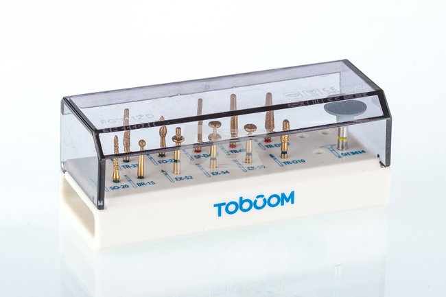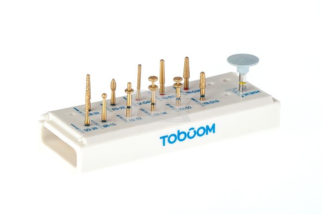 - Уникальный набор позолоченных, усиленных боров для препарирования зубов под керамические и циркониевые коронки;