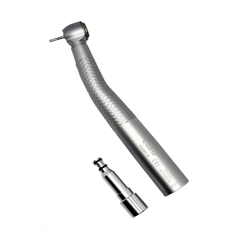 Наконечник турбинный COXO CX207-G с фиброоптикой, укомплектован переходником  (стандарт Kavo), стальными подшипниками, тройным распылителем воды и воздуха, производства COXO