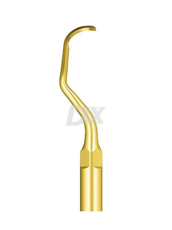 P14RT - насадка с нитрид-титановым напылением, правоизогнутая с тонким лезвием на конце. Рекомендуется для высокоэффективного удаления зубных отложений в глубоких пародонтальных карманах слева.