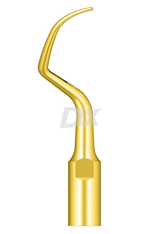 PD20RT - Насадка с нитрид-титановым напылением, правоизогнутая, для высокоэффективного удаления твердых зубных отложений в пародонтальных карманах средней глубины слева.