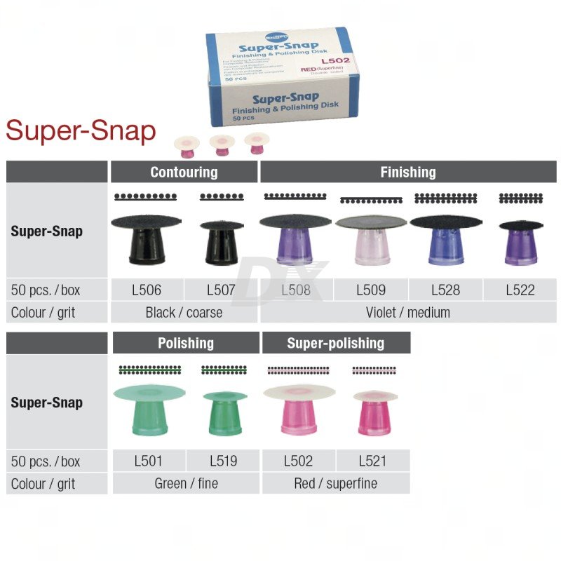 - Диски «Super-Snap» отличаются отсутствием отверстия для закрепления дискодержателя - что позволяет полностью использовать рабочую поверхность с одной тороны и, благодаря их сверхгибкости изымать максимум эффекта со стороны дискодержателя. Диски Super-Snap полируют микрофильные и гибридные композитные пломбы просто, быстро и надёжно. Это диски с покрытием, имеющие мягкую эластичную опору, которая просто насаживается на мандрель.