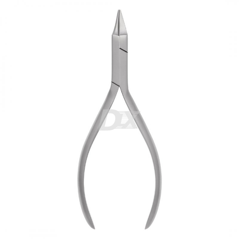 - Конструкция и свойства – одна щечка щипцов пирамидальной формы с плоской рабочей поверхностью, вторая имеет конусообразную форму (округленная рабочая поверхность). Щипцы позволяют наносить небольшие плавные вигини на дугу, формировать петли и т. д. Хорошо подходят для гибки дуг ТМА, которые могут ломаться при использовании инструмента с острыми гранями.