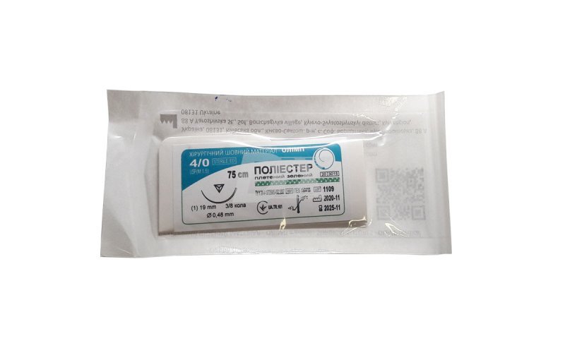 ОПИСАНИЕ Нерассасывающийся синтетический плетеный мультифиламентный шовный материал Полиєстер 75 см, 4/0 зеленый