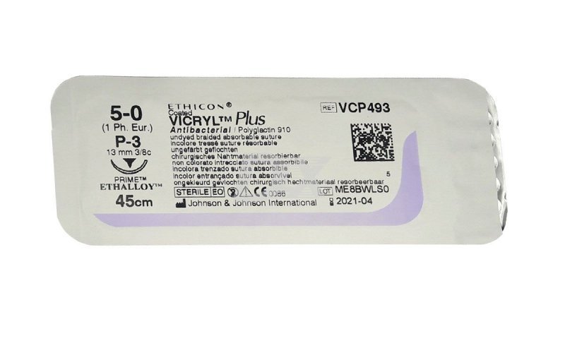 ОПИСАНИЕ VICRYL PLUS — синтетическая хирургическая плетеная нить со средним сроком рассасывания, обработанная антисептиком (плетеная, не окрашен) 45 см, 5/0