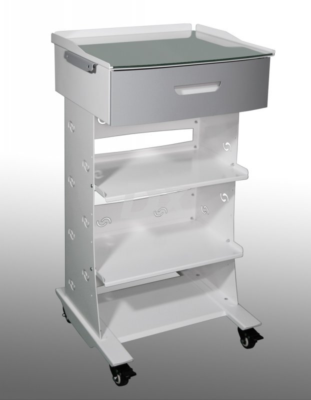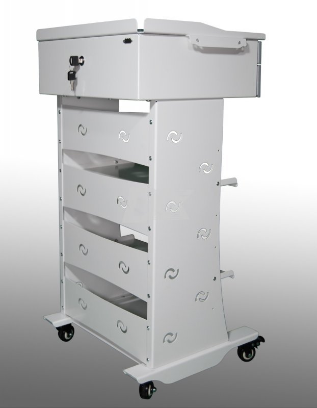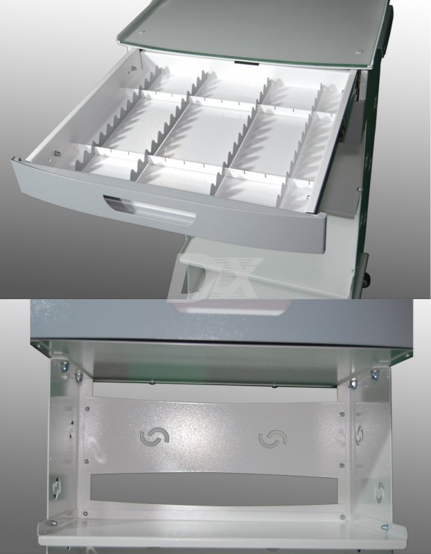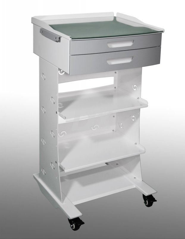 Стойка передвижная из металла, для инструментария и расходных материалов, 2 (1 под заказ) выдвижных ящика на полную длину (белые фасады), 2 средних полки.