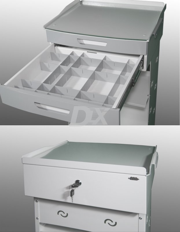 Базовая комплектация по умолчанию: 2 выдвижных ящика, 2 средних полки, замок на все ящики, ролики для твёрдого пола с тормозом и без, стекло 5 мм., с обработанным краем, цвет фасадов белый. Средние полки можно переставлять по высоте, с шагом в 8см. или при необходимости перевернуть, загнутым передним бортиком в верх;