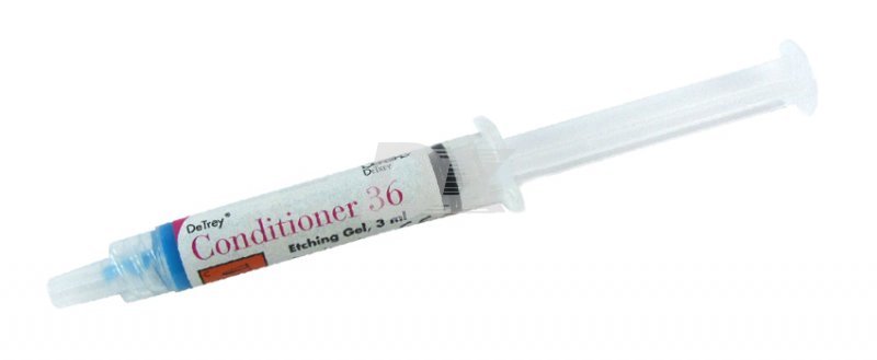 • Conditioner 36 является синим тонированым гелем, содержащим 36% фосфорной кислоты для травления зубной эмали и кондиционирования дентина перед склейкой с материалами на основе синтетических смол. Легко вымывается водой.