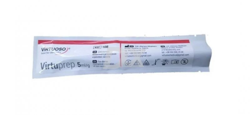 - Препарат VirtuPrep имеет гелевую структуру, содержит в своем составе: ЭДТА (15% этилендиамин тетраацетат), водный раствор гликоля и 10% пероксида водорода. Использование геля требует изолирования рабочего поля от ротовой полости с помощью коффердама. Отличные результаты подготовки канала к пломбированию отмечаются при совместном использовании "Виртупрепа" и апекслокатора.