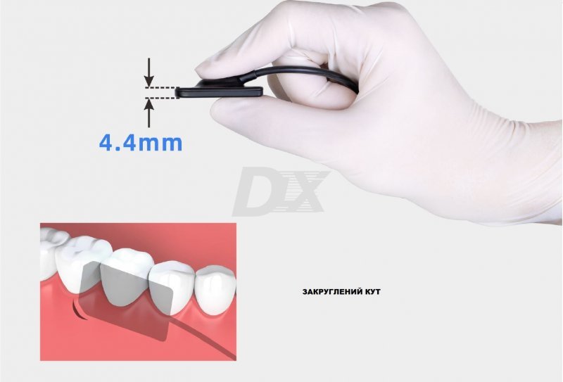 - Тонкий сенсор 4,4 мм, эргономичный с закругленными углами, что обеспечивает удобное позиционирование в полости рта пациента