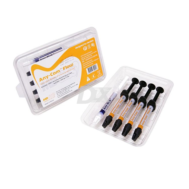 - Any-Com Flow – текучий фотополімерний, рентгено-контрастний, гібридний, цирконій, що містить, посилений наповнювачем композит для реставрацій.