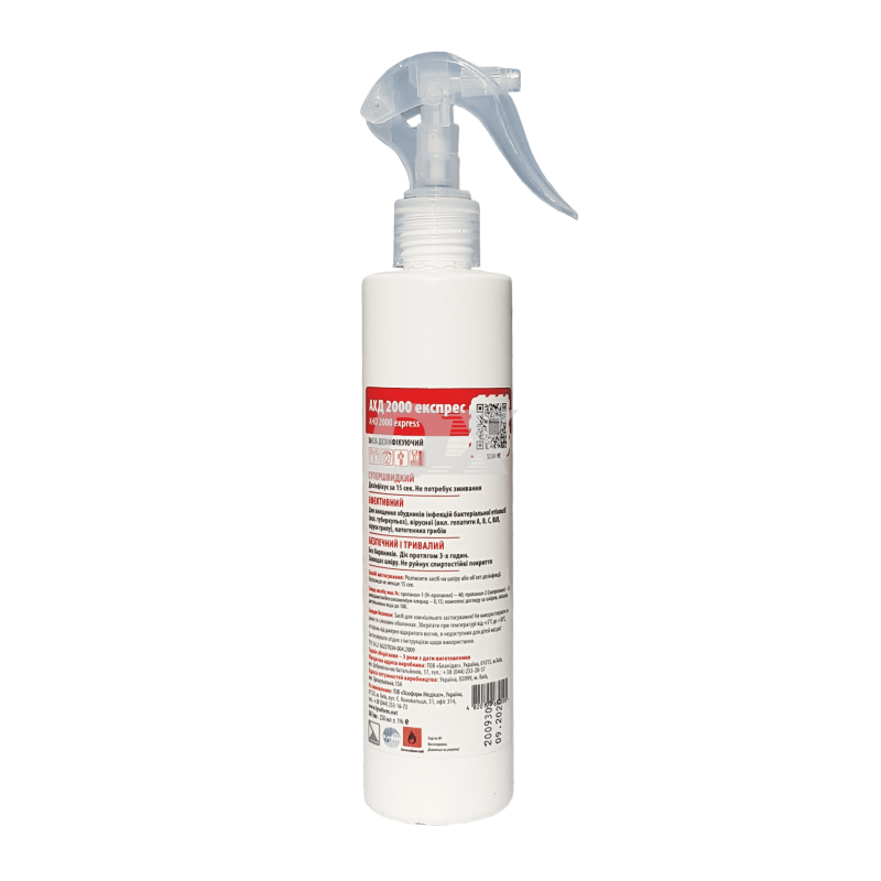 ОПИС АХД 2000 експрес 250 мл з дозуючим тригером – дезінфікуючий засіб для гігієнічної та хірургічної обробки рук і шкіри, а також для швидкої дезінфекції невеликих поверхонь, некритичних медичних виробів.