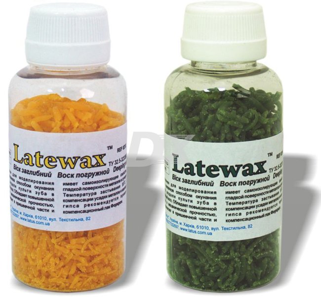 • воскова композиція приготована на основі парафіну. Latewax занурювальний має підвищену пружність та механічну міцність, добре прилягає до пришийкової частини та має самоізолюючу властивість на гладкій поверхні металу та супергіпсу. Робоча температура розплаву – 80 °С, температура застигання – 72 °С. Випускається у вигляді дрібної крихти жовтого або зеленого кольору.