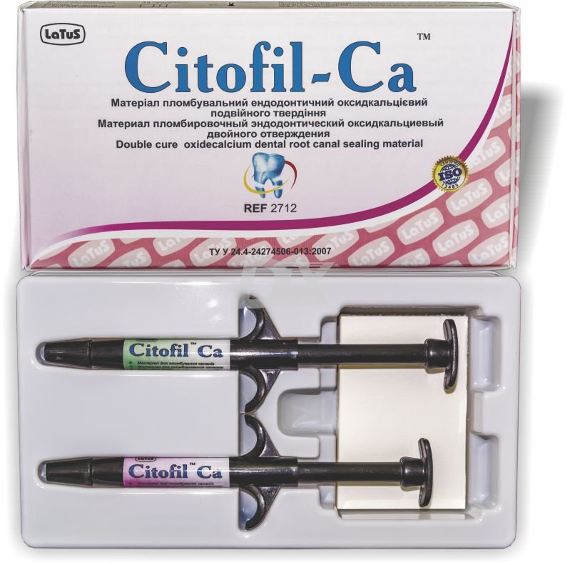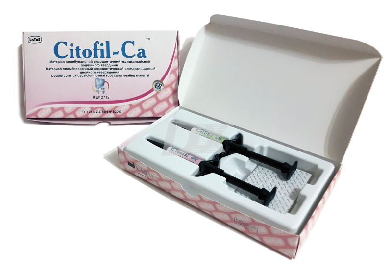 - Citofil-Ca представляє собою рентгеноконтрастний текучий композит подвійного твердіння, який складається з основної і каталізаторної паст. Матеріал містить оксид кальцію, який при взаємодії з вологою довгий час підтримує лужне середовище (рН 11-12) в каналі зуба.