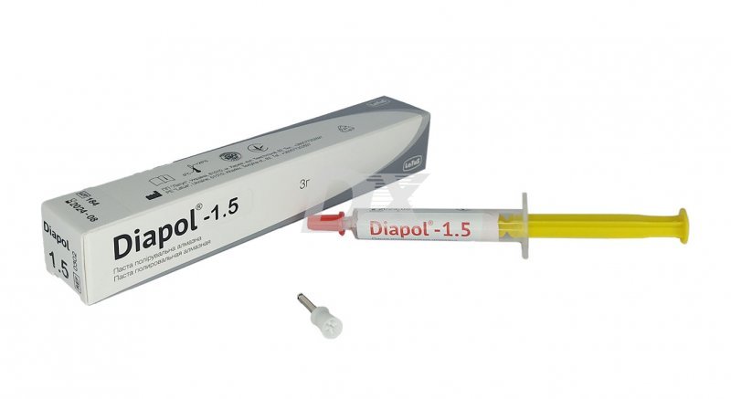 • Паста Diapol-1.5 застосовується в зуботехнічній стоматології для  полірування поверхні пломб і реставрацій з композиційних матеріалів із середньоюдисперсністюнаповнювача (переважно до 3 мкм), а також металевих елементів мостоподібних протезів.  При поліруванні пастою Diapol-1. 5 композитів потрібно 40…60 с, металу - 1,5…2 хвилини.