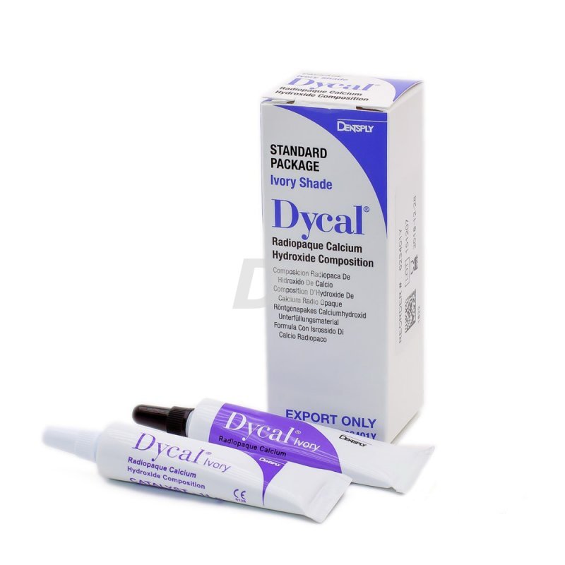 - рентгеноконтрастний матеріал на основі гідроксиду кальцію Dycal Radiopaque Calcium Hydroxide Composition – це міцний, самотверднучий, рентгеноконтрастний препарат гідроксиду кальцію. Він не перешкоджає полімеризації реставрацій з композиційних матеріалів або матеріалів на основі акрилових смол;