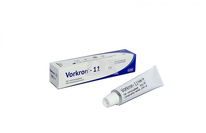 - Vorkron-11 призначений для створення тимчасового проміжного шару на гіпсовій моделі кукси зуба з метою компенсації усадки металу й утворення дистанційного зазору під фіксуючий цемент. Лак може бути використаний для ізоляції від воску.