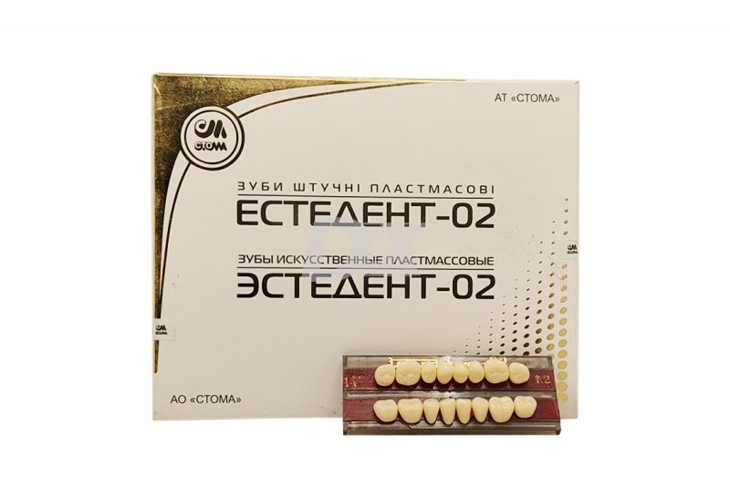 - Зуби Естедент-02 виготовлені на основі зшитих акрилових полімерів. Вони мають флуоресцентний ефект (в ультрафіолетовому світлі штучні зуби, вставлені в частковий протез, виглядають гармонійно поруч з природними зубами).