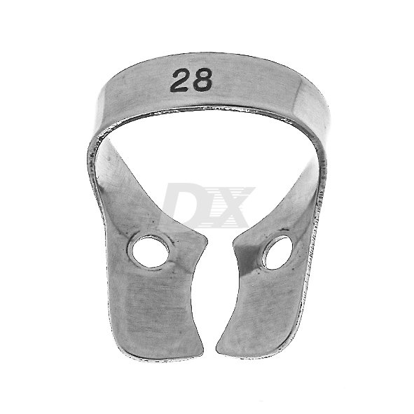 • Кламп №28 для молярів верхньої і нижньої щелепи. Крила відсутні, збільшені щічки увігнуті в апикальном напрямку. Ідеальний як якірний Кламп на зуби з великою коронковой частиною. Можлива надійна фіксація на сильно зруйновані зуби з невеликою ретракцией крайових ясен і ясенних сосочків. Широкі щічки забезпечують хороший огляд з усіх боків і не дають хустці, при натягу, наближатися до коронкової частини зуба в момент її препарування ротаційними інструментами.