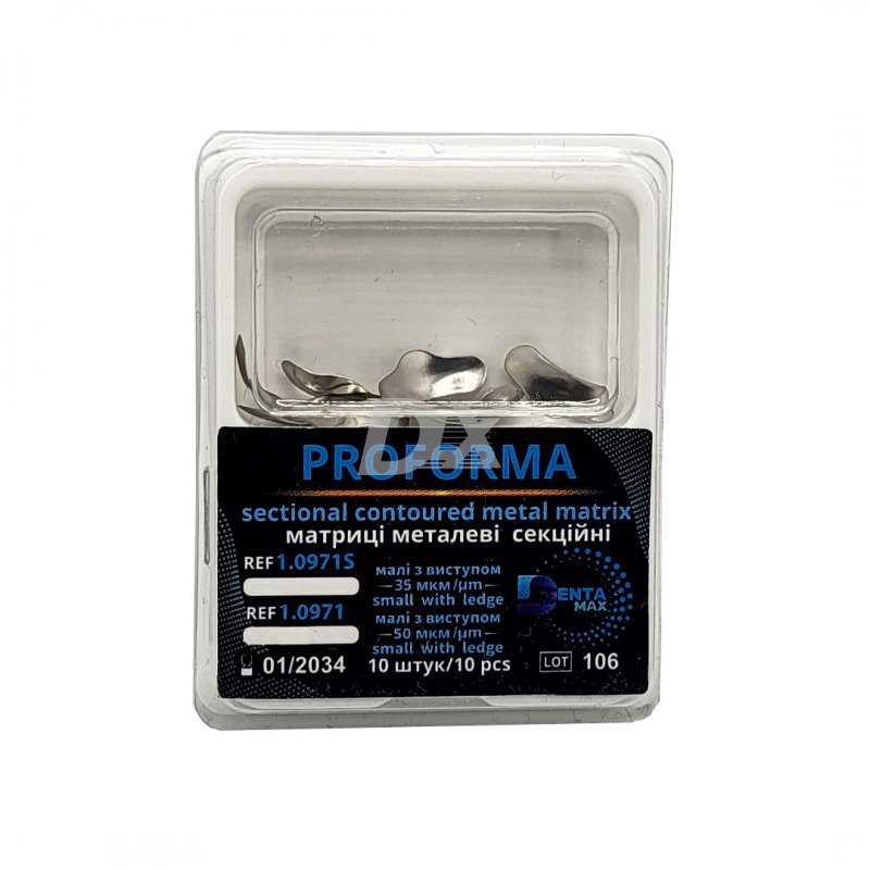• Матриці металеві секційні призначені для поділу апроксимальних поверхонь сусідніх зубів при реставрації типу II. Усі матриці - об'ємні, увігнуті, сформовані із спеціальної корозійностійкої сталі.