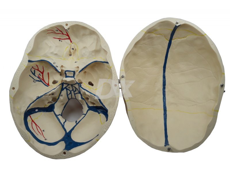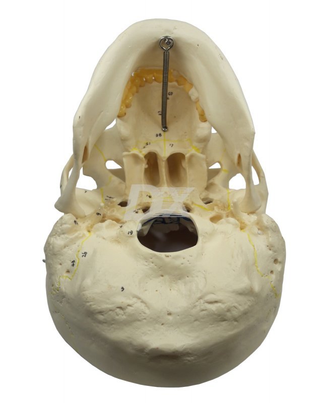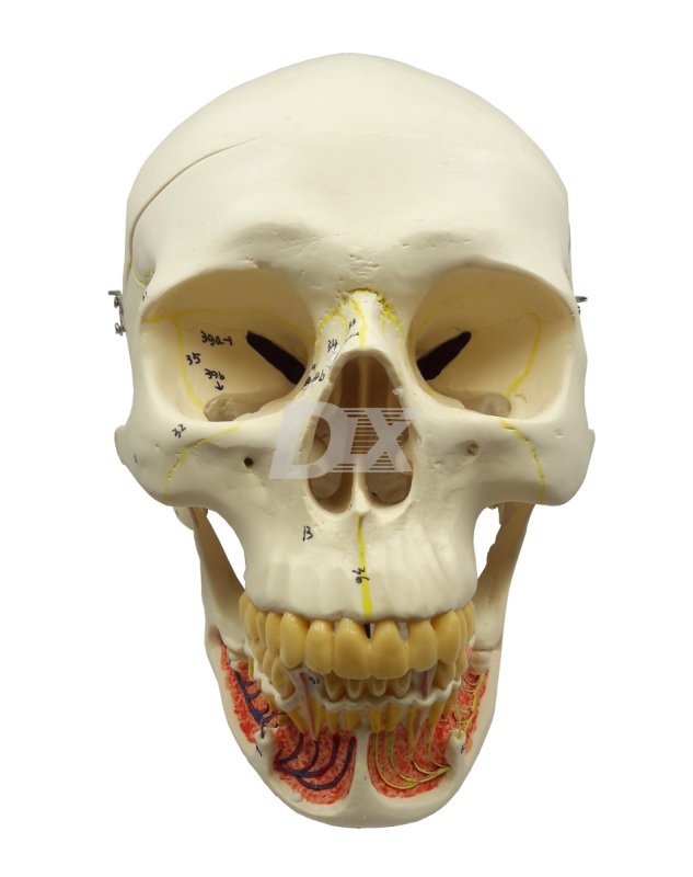 • високоточна копія справжнього черепа. Череп виготовлений з міцної пластмаси, що не б’ється. Ця модель має високу точність виконання анатомічних деталей. Розбирається на 3 частини для детального вивчення.