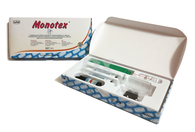 - Monotex виготовлений на основі спеціально синтезованого сполучника на основі Біс-ДМА, ГЕМА та глутарового альдегіду. Адгезив також містить ефективний детергент-антисептик-бензалконіюхлорид, 17% наповнювача з розміром частинок 0,4 мкм і мінімальною кількістю (до 20%) високолеткого многокомпонентного розчинника. Завдяки механічній дії наповнювача при нанесенні адгезиву відбувається заповнення усть дентинних трубочок з утворенням додаткового механічної зв'язку пломбувального матеріалу зі стінками порожнини.