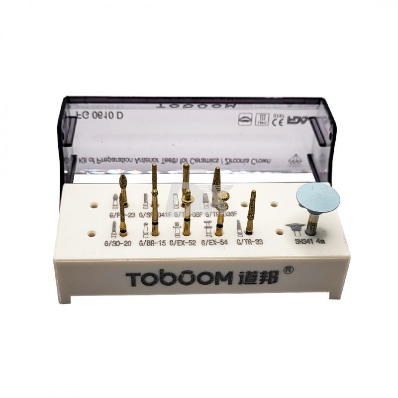 - унікальний набір позолочених, посилених борів для препарування фронтальної групи зубів;