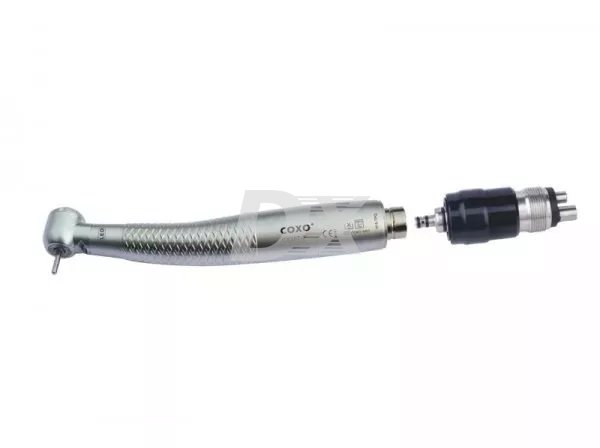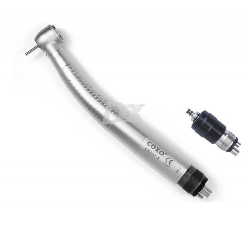 Стоматологічний турбінний наконечник з ортопедичною головою CX207-F з вбудованим LED генератором світла, німецькими підшипниками від Myonic, потрійним розпилювачем води і повітря, виробництва COXO.