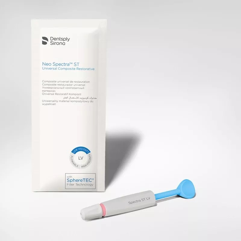 • Neo Spectra ST LV - це універсальний композит низької в'язкості, трохи м'якший, ніж матеріал HV (високої в'язкості), легко розподіляється на поверхні.