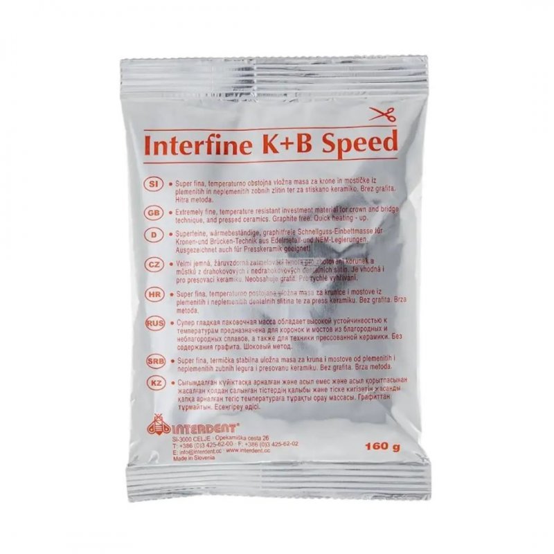 - Interfine K+B Speed – супергладка пакувальна мася на базі фосфату для коронок та мостів з благородних та неблагородних сплавів та для пресованої кераміки. Маса підходить для шокового та конвенційного методу нагрівання. Заливається без використання металевої опоки. Розширення пакувальної маси обумовлено дією рідини Expasol, що замішує.